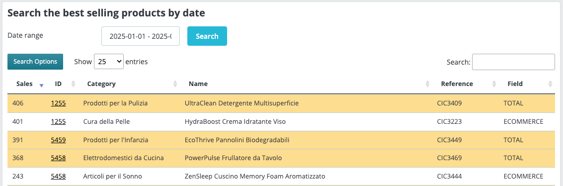 Questa funzionalità permette di identificare i prodotti che registrano il maggior numero di vendite sul tuo ecommerce. Grazie a un'interfaccia intuitiva, puoi visualizzare i prodotti top-seller, analizzare le tendenze di mercato e ottimizzare l'assortimento del tuo inventario basandoti sui dati di vendita reali.